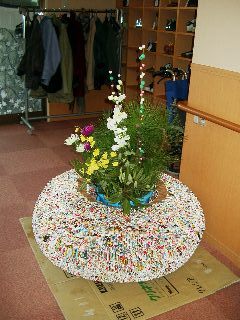 新年のお花を飾りました。お花を生けた花器は新聞の折込広告を使って、利用者の方たちがひとつひとつ手作りしたものです。