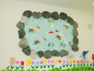 この池も、利用者さんとスタッフが一緒に作った大作です。池の中には金魚もいて、まるで本物の池のようでした。